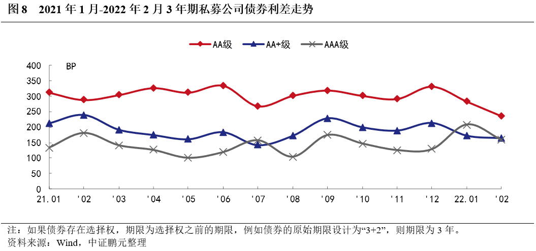 就發行利率而言,2022年2月份交易所公司債券的最高利率為8.0%,較上月最高利率下降50BP;最低發行利率為2.15%,較上月最低利率下降15BP。與1月份相比,公募公司債券方面,AAA級平均發行利率上行9BP、利差擴大11BP,AA+級平均發行利率下行33BP,利差收窄31BP;私募公司債券方面,AAA級平均發行利率上行27BP、利差擴大28BP,AA+級平均發行利率下行30BP,利差收窄25BP,AA級平均發行利率下行65BP、利差收窄59BP。AA+和AAA級私募公司債的發行利率和發行利差仍倒掛,但差值較上月收窄。