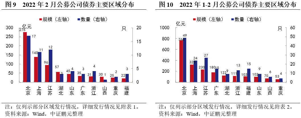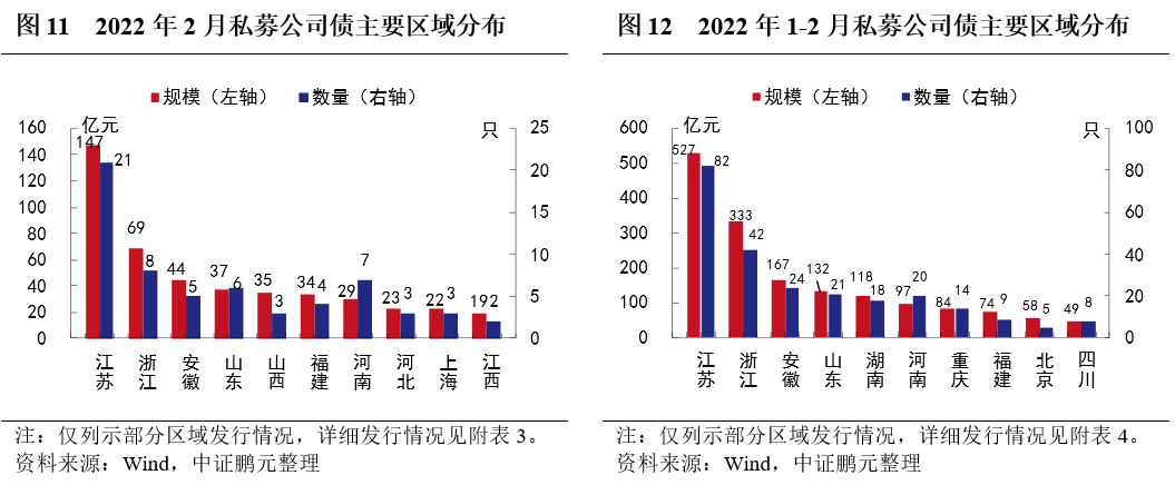 區域分布方面,2月份公募公司債券發行人以北京、上海、江蘇地區為主,私募公司債主要分布在江蘇、浙江、安徽地區。