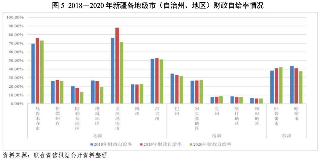 財(cái)政自給率[2]方面,烏魯木齊市和克拉瑪依市的財(cái)政自給程度較高,為70%左右;昌吉州2018-2020年財(cái)政自給率維持在52%左右;新疆其余地級(jí)市(自治州、地區(qū))的財(cái)政自給程度較低,不足45%。