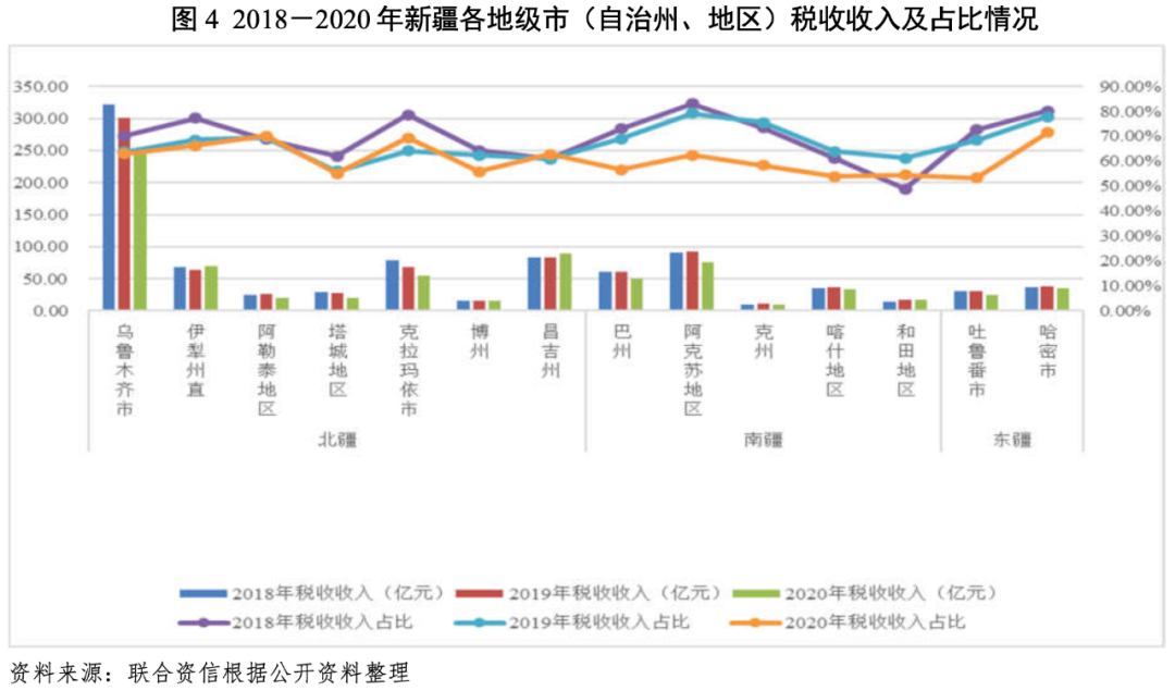 從一般公共預(yù)算收入結(jié)構(gòu)看,2018-2020年,除阿勒泰地區(qū)、克拉瑪依市、昌吉州和和田地區(qū)外,其余地級(jí)市(自治州、地區(qū))稅收收入占一般公共預(yù)算收入的比重均有不同程度的下降,2020年各地稅收收入占比分布在50%~72%之間。其中,塔城地區(qū)、博州、巴州、克州、喀什地區(qū)、和田地區(qū)、吐魯番市的稅收收入占比低于60%,一般公共預(yù)算收入的穩(wěn)定性一般。