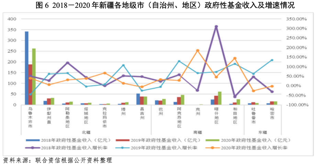 政府性基金收入方面,新疆的政府性基金收入主要集中在烏魯木齊市,2018-2020年烏魯木齊市的政府性基金收入占全新疆的55.68%、35.57%和44.40%。其余地級(jí)市(自治州、地區(qū))的政府性基金收入較低。