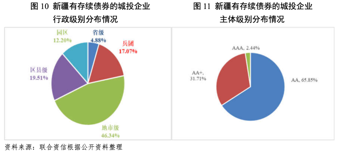 從主體信用級(jí)別區(qū)域分布看,新疆發(fā)債城投企業(yè)中AAA級(jí)主體1家,為烏魯木齊城市建設(shè)投資(集團(tuán))有限公司;AA+級(jí)城投企業(yè)13家,其中自治區(qū)級(jí)城投企業(yè)2家、兵團(tuán)級(jí)城投企業(yè)2家,烏魯木齊市本級(jí)和園區(qū)城投企業(yè)各2家,其余分布在伊犁州、昌吉州、巴州和阿克蘇地區(qū);AA級(jí)城投企業(yè)27家,其中兵團(tuán)級(jí)城投企業(yè)5家,伊犁州和烏魯木齊市城投企業(yè)分別為6家和4家,其余分布在昌吉州、阿克蘇地區(qū)、哈密市、巴州、博州、和田地區(qū)、喀什地區(qū)和吐魯番市。