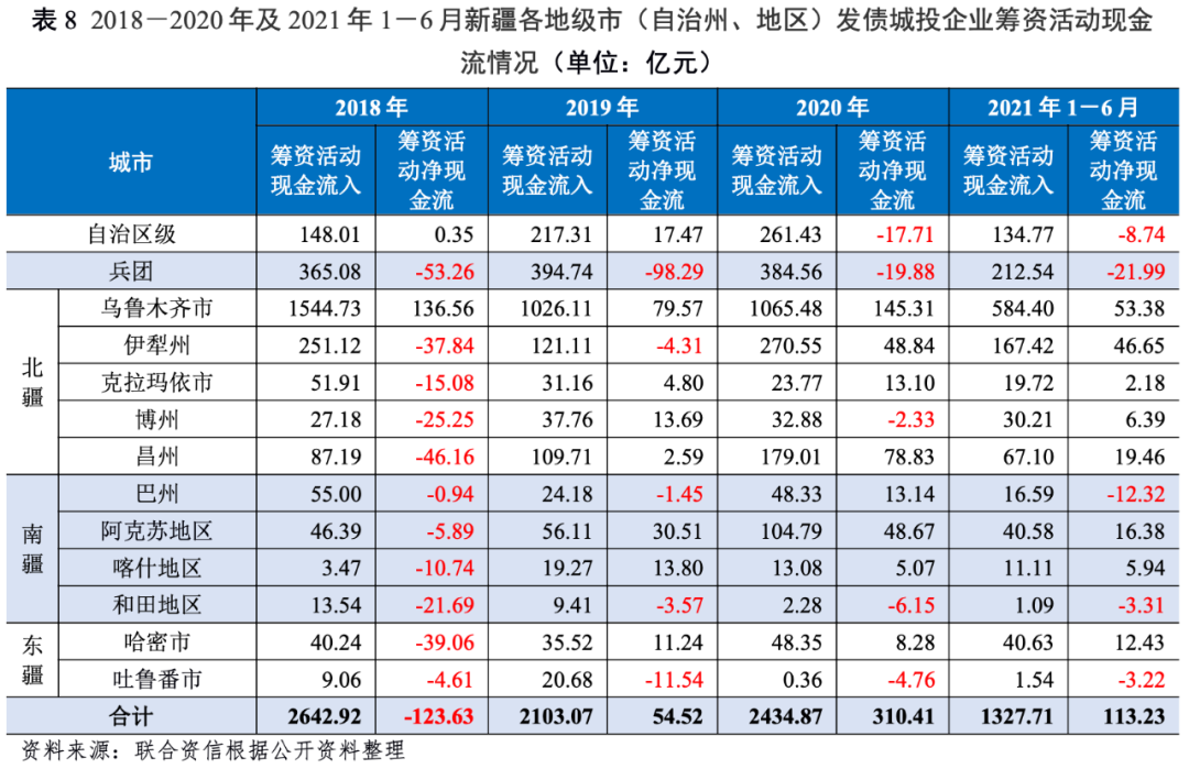 從新疆發(fā)債城投企業(yè)籌資活動(dòng)凈現(xiàn)金流狀況看,2020年,除自治區(qū)級(jí)、兵團(tuán)、博州、和田地區(qū)和吐魯番市發(fā)債城投企業(yè)整體籌資活動(dòng)現(xiàn)金流呈凈流出狀態(tài)外,其余地區(qū)發(fā)債城投企業(yè)整體籌資活動(dòng)現(xiàn)金流均呈凈流入狀態(tài),烏魯木齊市、伊犁州、昌吉州和阿克蘇地區(qū)籌資活動(dòng)現(xiàn)金流入規(guī)模相對(duì)較高。2021年上半年,自治區(qū)級(jí)、兵團(tuán)、巴州、吐魯番市和和田地區(qū)籌資活動(dòng)現(xiàn)金流為凈流出。綜合看,烏魯木齊市、伊犁州、昌吉州和阿克蘇地區(qū)發(fā)債城投企業(yè)的籌資能力明顯強(qiáng)于其余區(qū)域發(fā)債城投企業(yè),兵團(tuán)、和田地區(qū)和吐魯番市籌資活動(dòng)現(xiàn)金流持續(xù)凈流出。