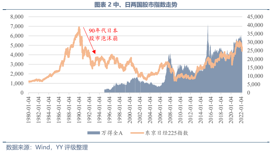 股市2022年開年以來在俄烏沖突、大宗商品暴漲等因素下經歷暗黑行情,萬得全A指數3月份最低點較12月份最高點(也是2016年以來最高點)跌去約21%。不過預計此輪下跌不足以像日本一樣引發全社會的資產負債表衰退危機,主要原因有以下兩點:一是中國股市存在巨大泡沫的可能性遠小于日本當時(3月下旬萬得全A指數相較過去5年最低點僅高出65%,而日本泡沫崩塌的前五年日經225指數漲幅超過200%);