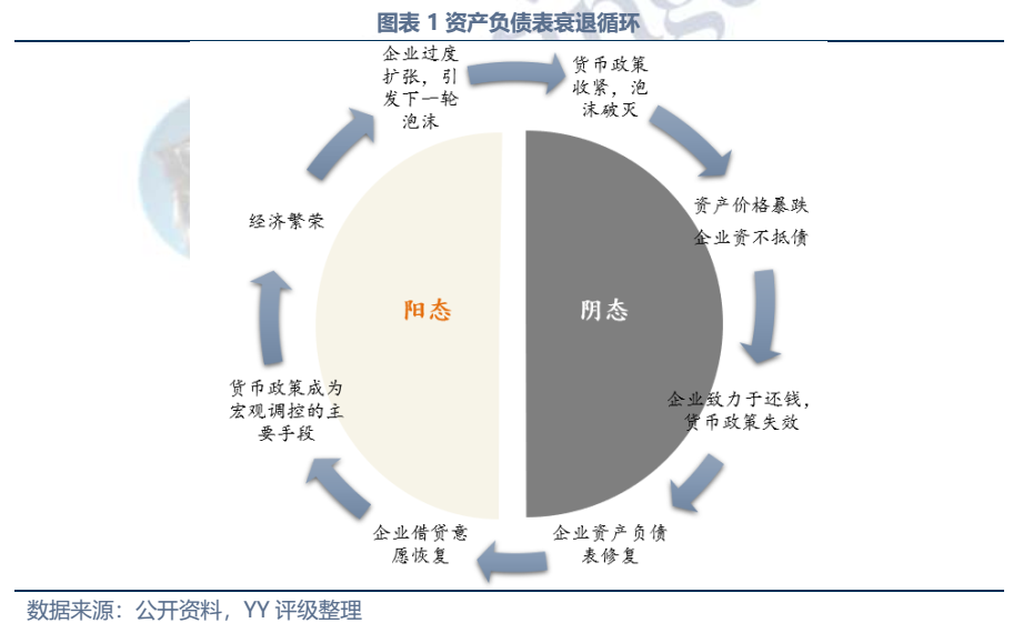 依據“資產負債表衰退”理論,當貨幣政策收緊使得資產泡沫破滅時,大批企業將陷入資不抵債的局面,并開始致力于使債務最小化而非利潤最大化,企業賺取的現金流都用來還債,人們也節衣縮食努力存錢還貸,社會的投資、消費萎縮,貨幣政策失效,經濟陷入螺旋式下降。