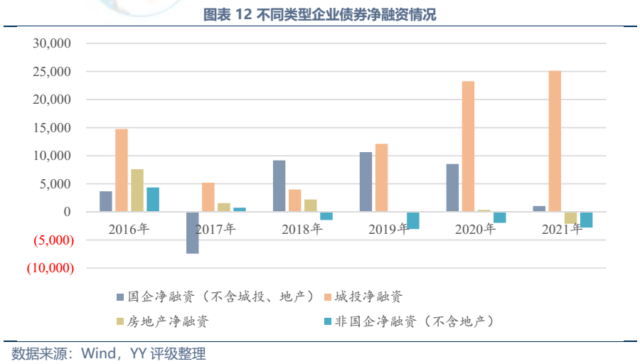 2018年以來,非國企部門(不含房地產)債券凈融資持續為負。一方面民營企業過去累積違約率確實顯著高于國企,YY評級9、10的265個主體中,央企、地方國企合計僅54個,因此金融機構對于民企的認可度總體仍較低。另一方面,即使是資質較好的民企,近年來在投融資方面也趨于謹慎,如投資級非國企(不含地產,YY等級1~5-)2021年凈融資規模也達-236億元,一項原因是近些年錢不如過去好賺,各行各業投資風險提升,且民企外部支持弱,再融資受行業景氣度、企業經營業績影響很大,穩定性弱,杠桿要加上去容易,但投資有回收期,這個期間再融資能否維持不確定性大;且負債是剛性的,而資產的風險增加,因此近年來民企加杠桿意愿減弱。
