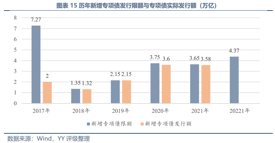 嚴控地方政府隱性債務是不可放松的底線,以往的城投,角色定位是突破了財政硬約束,通過土地杠桿,實現土地金融化的資金撬動功能,但對于地方政府在其中的職責是沒有厘清的,不同時期、不同區域的地方政府理解不同,地方政府、平臺、投資對于其權利義務的范圍理解也不同,而規范的債權債務關系應當是權利、義務、各方當事人等要素完備、明確且受法律保護的。明確屬于政府性工程的,應當嚴格納入財政預算并由政府作為債務主體。因此當前遏制新增隱性債務相關政策密集出臺,同時政府顯性債務作為替代發力明顯,2020年、2021年兩年財政赤字率都超過3%的紅線,同時2020年以來專項債年新增發行規模在3.6萬億左右,2022年下達的新增專項債限額達到3.65億元,較2021年持平(下圖有誤)。