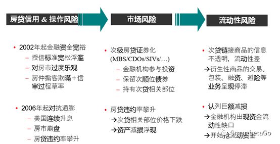 不同的風(fēng)險之間相互傳導(dǎo),這一點在2008年金融危機(jī)中表現(xiàn)的尤其明顯。2008年金融危機(jī)源自于信用風(fēng)險與操作風(fēng)險的控管松散,蔓延擴(kuò)散至市場風(fēng)險與流動性風(fēng)險,如下圖所示: