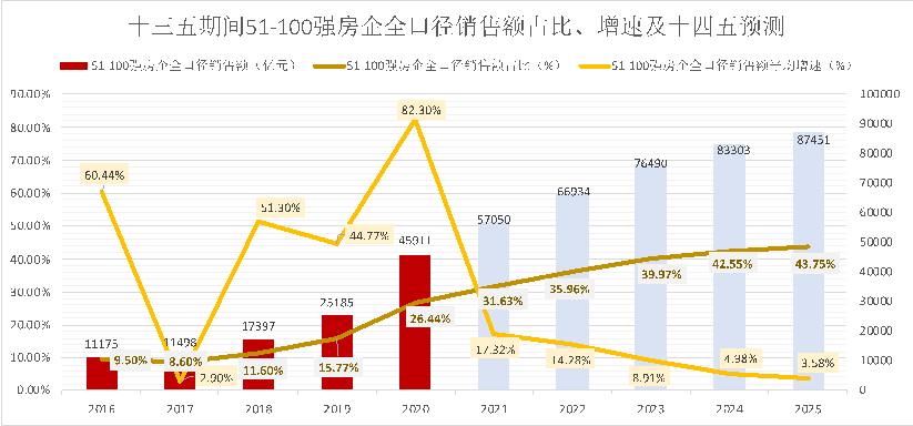 預計51-100強房企銷售額會在十四五期間繼續保持增長,但是隨著大盤子的增速放緩以及50強房企的規模擠壓,增速會呈現回落,但份額依然有穩步做大的空間。