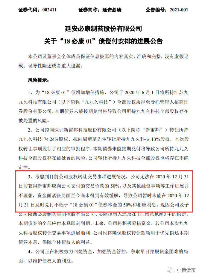 1月5日,延安必康(002411.SZ)公告稱,暫時(shí)未能在2020年12月31日及時(shí)兌付不低于“18必康01”債券本金的50%和相應(yīng)利息,合計(jì)約3.86億元。