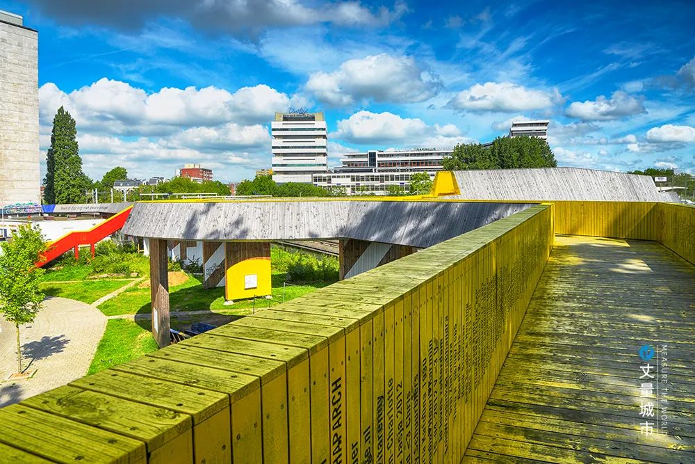 城區的「Luchtsingel」人行天橋,通過長400米、前衛明黃色的人行天橋將城市公園、都市綜合體、車站等割裂的公共場所聯結在一起,打造了屬于行人的「立體城市」,把市民帶回到城市公共網絡之中。
