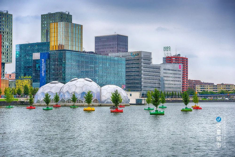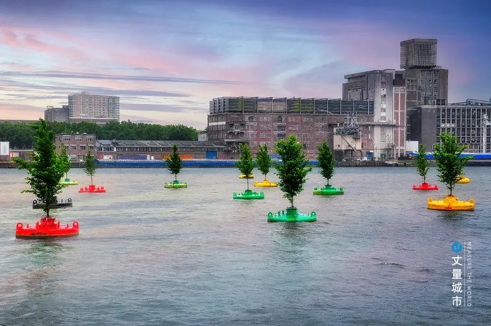 鹿特丹于2016年正式實施「漂浮的森林」計劃,該計劃將20棵樹木種在回收利用的彩色浮筒內,并放置在瑞恩港的水面上,將港口變身為頗具藝術感的創意漂浮森林,提升水面「顏值」的同時更起到綠化城市的作用。