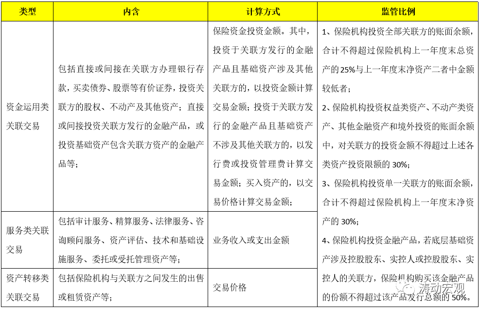 保險機構的關聯交易同樣有三類,同時文件明確保險機構與其控股子公司之間,以及控股子公司之間發生的關聯交易不適用下表的約束。此外,文件亦明確保險機構與非金融控股子公司對關聯方的投資余額應合并計算。
