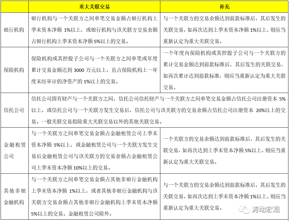 銀行機構的關聯交易主要有三類,內容上則更為豐富和細化,如咨詢服務(主要指投行類)、信息服務等也被納入。同時文件亦明確銀行機構與境內外銀行關聯方之間開展的同業業務可不適用相關比例規定和重大關聯交易標準。