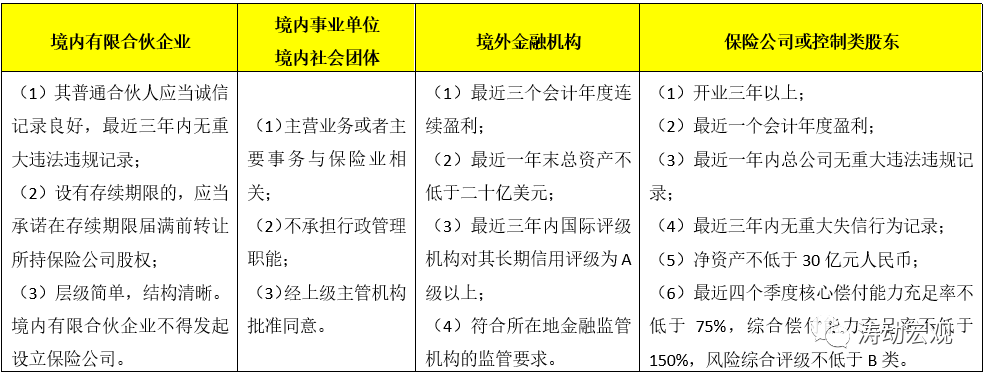 (3)針對保險公司股東為境內有限合伙企業、境內事業單位和社會團體、境外金融機構以及保險公司的,還有一些特別規定,具體如表: