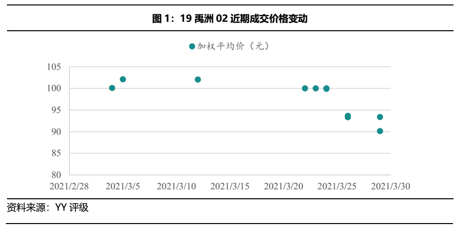 由于2020年初的黑天鵝事件使得房企在銷售和建設進度上均受到了一定影響,因而盈利預警在市場激起的水花并不大。但是3月25日,禹洲在補充公告中披露公司2020年未經(jīng)審核的凈利潤和歸母凈利潤分別為2.282億元和1.17億元,較2019年度分別減少37.39億元和35.94億元,降幅之大遠超市場預期,引起一片嘩然,疊加穆迪下調(diào)公司的企業(yè)家族評級(由下調(diào)至“B1”,展望調(diào)為“負面”),所以盡管公司管理層在3月26日開了一個簡短的線上溝通會,強調(diào)自身銷售、運營和現(xiàn)金流仍然保持穩(wěn)健,沒有受到影響,但并未提振市場信心,禹洲境外多只美元債創(chuàng)新低,境內(nèi)債“19禹洲02”在接下來的幾個工作日也遭到拋售,價格跌破95元。