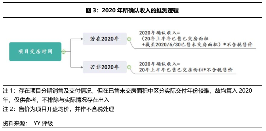 然后,我們通過公開渠道查詢這些項目的交房時間,根據(jù)下圖所示邏輯計算2020年確認/結轉的收入,并根據(jù)公司對這些項目的持股比例簡單區(qū)分是并表收入還是合聯(lián)營公司收入。
