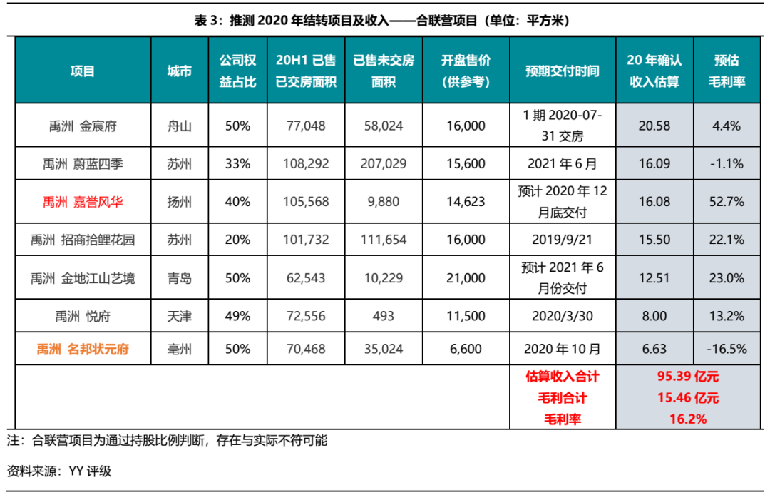 挖掘方法:因房企于資產(chǎn)控制權轉讓至客戶(房屋交付)時確認收入,根據(jù)禹洲定期報告對土儲的詳細披露,我們以“已售已交房面積”為切入口,通過對比2020中報的各項目“已售已交房面積”相對于2019年報相同科目的增量,可以得到2020年上半年交房了一部分的項目。這些項目無論是否并表,均體現(xiàn)在2020年利潤表中。
