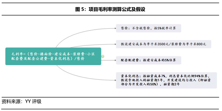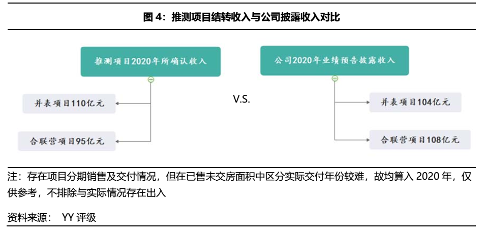 按照這種方法,我們推測2020年結轉的項目確認收入約為——并表項目110億元,合聯(lián)營項目95億元,與公司披露的收入差異不大,因而具備參考性。而毛利率測算因涉及較多假設(毛利率測算方法參見后文),僅爭取做到盡可能全面地估算,未免發(fā)生與實際項目開發(fā)存在出入的情況:估算的并表項目結轉毛利約16.07億元,與公司披露的4.8億元差距在11億元;合聯(lián)營項目結轉毛利15.46億元,與公司披露的19.6億元相差4億元。