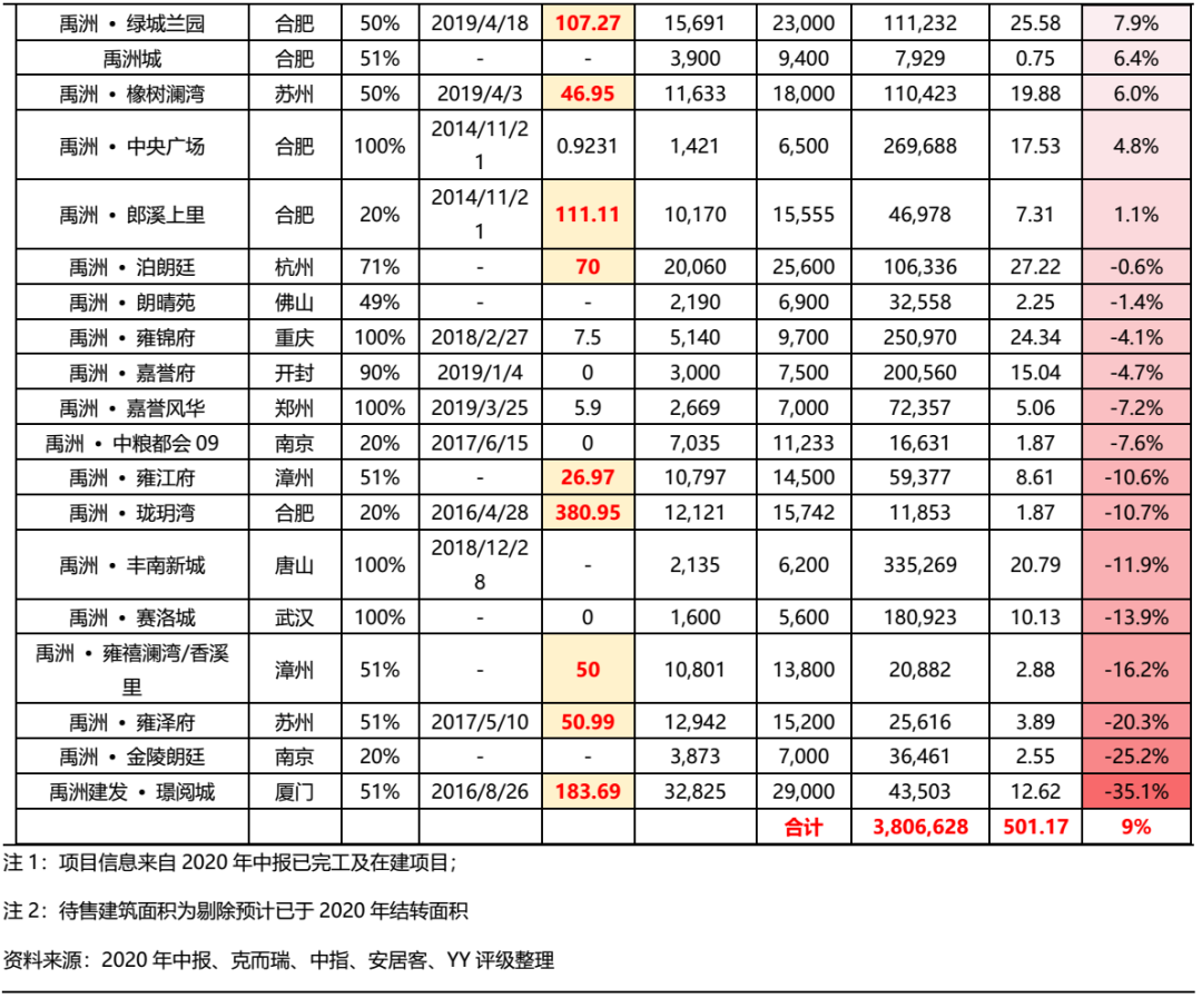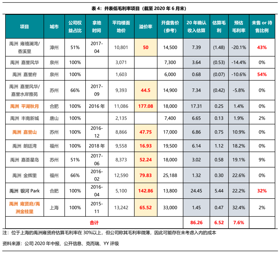 如此簡單估算下來,18個并表項目中有11個項目毛利率不足25%(參見下表),甚至部分項目已然虧損,如漳州的雍禧瀾灣、泉州的嘉譽風華和嘉譽府,以及蘇州的嘉譽風華。公司上述微薄毛利率項目均在其中——合肥的禹洲平湖秋月、蘇州的禹洲嘉譽山、亳州的禹洲名邦狀元府,除此以外,低毛利率項目還包括一些位于福州、蘇州、唐山和合肥的項目。下表項目估算收入合計約86億元,占公司2020年并表營業(yè)收入(104億元)的83%;但預估毛利僅有6.5億元,即毛利率僅7.6%,若再考慮土增稅、銷售渠道費用等,則這些項目盈利更為艱難。
