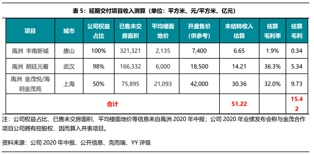 根據(jù)公司所述“上海的若干項目的開發(fā)進度及于武漢及唐山的項目交付有所延期”,以及“上海項目為與金茂合作項目”等信息,我們在2020年中報中找到如下在建項目,以“已售未交房面積”作為本該于2020年交付但實際延期交付的面積,結合開盤售價信息,估算出未結轉收入合計為51.22億元,毛利15.42億元(若按公司所述三個項目毛利率在25%估算,則未結轉毛利為12.8億元)。作為參考,公司2020年結轉收入較2019年減少128億元,我們的不完全統(tǒng)計可解釋其中的40%。