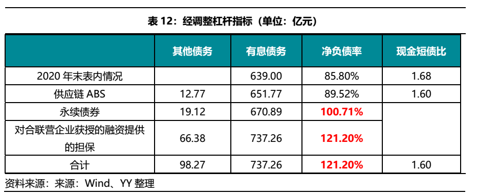我們將供應鏈ABS由經(jīng)營性債務調(diào)入有息債務,將對合聯(lián)營企業(yè)獲授的融資提供的擔保作為表外或有債務,并對永續(xù)債進行調(diào)整,調(diào)整后公司凈負債率超過監(jiān)管指標。