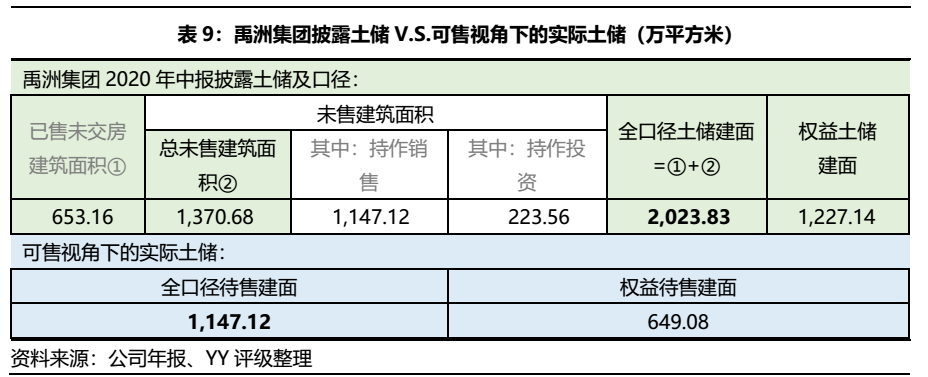 截至2020年12月31日,公司披露的總土儲為2,310萬平方米,總貨值約4,559億元,權益占比62%,并表比例60%,看起來充裕。但根據(jù)我們之前報告中對于禹洲中報披露的土儲口徑的拆分(公司2020年中報披露土儲全口徑為2023.83萬平方米,實際可售部分為1,147.12萬平方米,即打六折)來推測,公司實際可售土儲并不如看起來豐厚,若簡單粗暴按照六折估計,再乘以權益比(合作開發(fā)占比較大),則權益土儲約785萬平方米,有效貨值則為1,700億元(此為線性外推,仍以后續(xù)公司披露的土儲明細為準)。