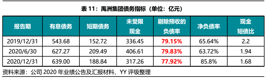 截至2020年末,禹洲集團有息債務總額639億元,其中短期占比約30%。三道紅線指標仍為僅觸碰一條,但正如我們在之前的報告中所揭示,公司合作開發(fā)比例較高,以及財務粉飾的動機使得非并表項目的負債具有一定風險敞口。