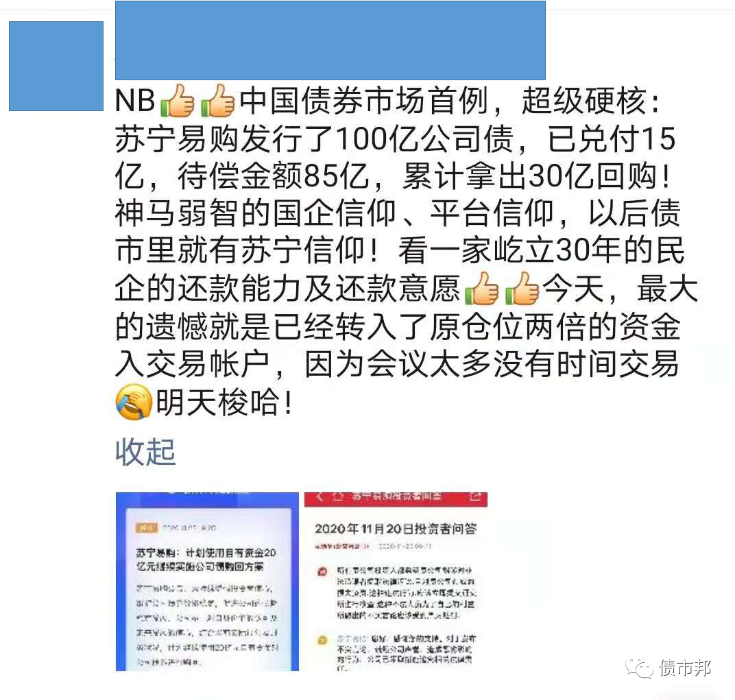 該舉措迅速博得了債券圈的一片掌聲,被譽(yù)為有擔(dān)當(dāng)有作為的優(yōu)秀發(fā)行人,可謂是賺足了市場(chǎng)的眼球。蘇寧相關(guān)同事甚至在朋友圈喊出了“神馬弱智的國(guó)企信仰、平臺(tái)信仰,以后債市里就有蘇寧信仰”的口號(hào)。頗有老王當(dāng)年“神馬清華北大,不如膽子大”的神評(píng)論風(fēng)采。