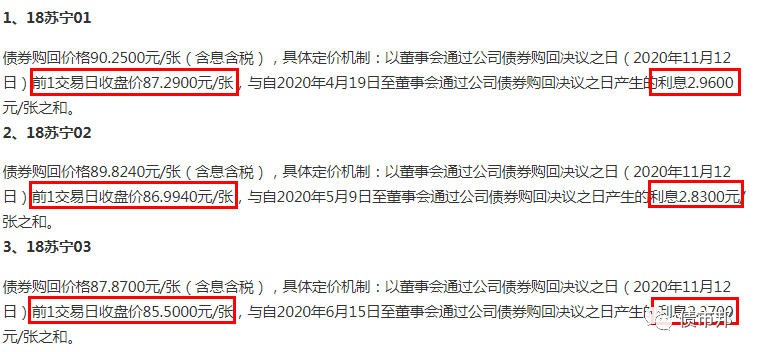 相關(guān)債券的回購(gòu)價(jià)格,是11月12號(hào)大跌之后的收盤(pán)價(jià)+應(yīng)計(jì)利息來(lái)確定的。以18蘇寧01為例,回購(gòu)凈價(jià)僅為87.29元,也就是說(shuō),發(fā)行人借了100元的本金,現(xiàn)在只用還87.29元了。