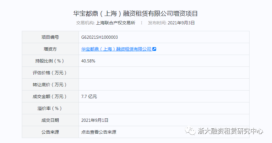 5 | 2021年2月10日 | 華寶都鼎(上海)融資租賃有限公司 | 16億元 | 19億元 | 3 億元 | 擬通過增資擴(kuò)股引入戰(zhàn)略投資者,目前交易所顯示增資已成交,3家戰(zhàn)投總成交金額為7.7億元。 |
