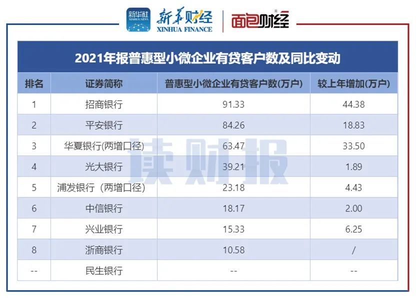 信披數(shù)據(jù)顯示,除民生銀行未公布有貸客戶數(shù)外,截至2021年末,招行銀行普惠型小微企業(yè)有貸客戶數(shù)最多,為91.33萬戶;其次是平安銀行和華夏銀行(兩增口徑)分別為84.26萬戶和63.47萬戶。