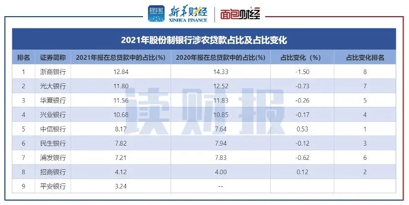 從變動情況來看,除平安銀行未披露2020年數(shù)據(jù)外,股份制銀行的占比普遍呈微降態(tài)勢,其中浙商銀行降幅最大,該行2021年涉農(nóng)貸款占比較2020年下降1.5個百分點(diǎn)。
