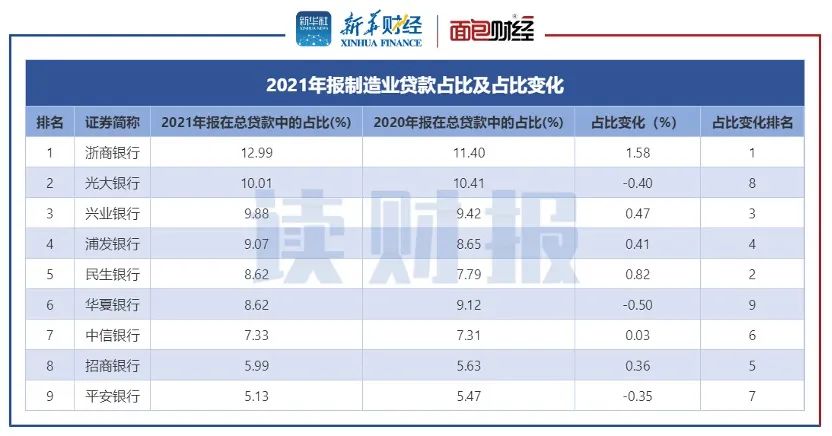 從增速來看,浙商銀行的制造業(yè)貸款增長較快,較2020年末相比增長28.11%;其次是招商銀行和興業(yè)銀行,較2020年末分別增長17.75%和17. 18%。而華夏銀行是股份制銀行中唯一一家制造業(yè)貸款下降的銀行。數(shù)據(jù)顯示,該行2021年制造業(yè)貸款較上年末下降0.79個百分點(diǎn)。