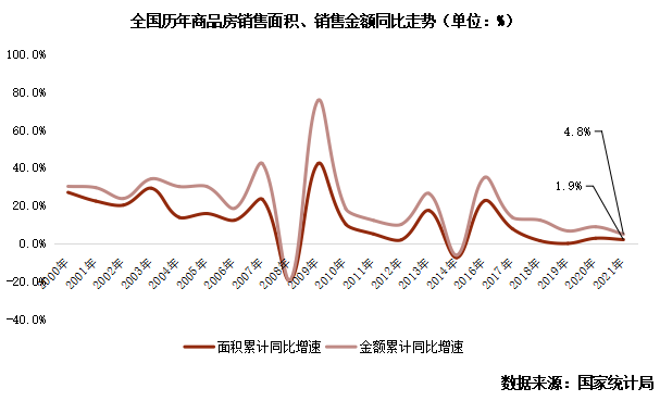 2021年,城市住房需求尤其是改善型住房需求穩步釋放,房地產業增加值比上年增長5.2%,拉動整體經濟增長0.4個百分點。但下半年新開工、土地購置和開發投資均降至冰點,“以價換量”和信貸寬松給予了年末市場一定“數據繁榮”。但本輪信貸、融資、土地等各方面調控暴露出一大部分城市已存在較大購買力透支問題,短期行業仍將面臨繼續下行壓力,各地區銷售分化和降價效用邊際遞減將繼續保持,預計商品房銷售規模在今年一季度仍將下調筑底過程中。