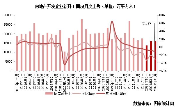 12月全國房屋新開工水平與11月持平,為16075萬平方米。但同比降幅擴大至31%,較11月擴大了10pcts。傳統的“年底開工潮”不再出現,進一步表明了民營開發企業當前仍處于較深困境,銷售回款和融資借款雙雙艱難下,新開工計劃普遍一再取消拖延。