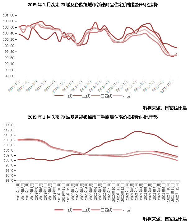 此外值得注意的是,12月70個大中城市新建商品住宅和二手住宅價格同比分別上漲2%和1%,其中二線城市分別上漲2.8%和1.5%。多個城市出臺二手房交易指導價后,2021年二手住宅市場遭遇較大價格降幅,同比降幅顯著。