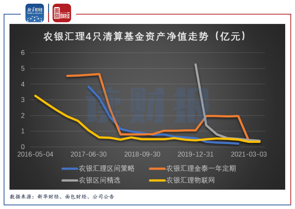 以清算起始日統(tǒng)計,2021年農(nóng)銀匯理共有4只基金因資產(chǎn)凈值不足5000萬而進(jìn)行清算,分別是“農(nóng)銀匯理區(qū)間策略”、“農(nóng)銀匯理物聯(lián)網(wǎng)”、“農(nóng)銀區(qū)間精選”、“農(nóng)銀匯理金泰一年定期”,其中前3個產(chǎn)品為混合型基金、第4個為債券型基金,且4個產(chǎn)品由個人投資者持有絕大部分份額。
