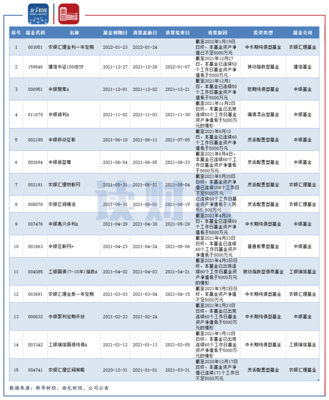 “農(nóng)銀匯理金利一年定期”近期發(fā)布公告稱,截至2022年1月19日日終,該基金資產(chǎn)凈值已不足5000萬元,該情形已觸發(fā)《基金合同》中約定的本基金終止條款,自2022年1月24日起進(jìn)入清算程序。
