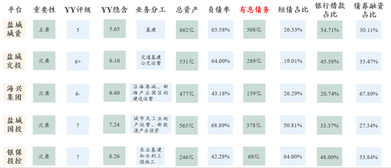 鹽城一年的預(yù)算收入不到400億元,基金收入高一點(diǎn)有600億,把地市級平臺的有息債務(wù)一拉,鹽城城資500多億,交投289,海興159,鹽城國投378,銀保68,債務(wù)的絕對規(guī)模相比于預(yù)算收入,是比較高。