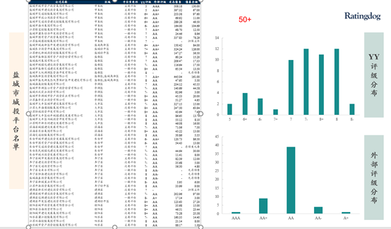 從平臺分布來看,確實(shí)是比較多。總體平臺數(shù)量有50來個,區(qū)縣級普遍超過3個,級別高度下沉。從外評來看,集中在AA;從YY評級來看,在7、7-、8+和8這四檔,有點(diǎn)厚尾,顯著右偏,投機(jī)級占比比較高,平臺確實(shí)是需要一定的整合。