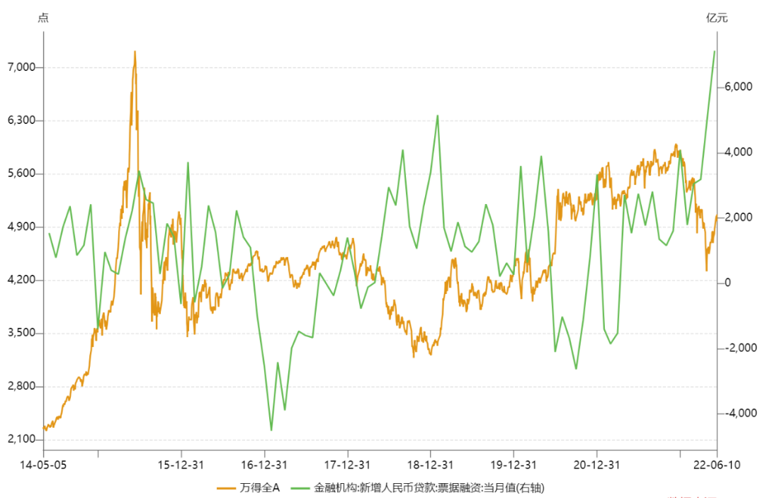 而票據融資這個調解信貸數據使用的工具,則與股市呈現反向關系。銀行需要靠票據貼現去沖信貸規模,說明實體不景氣,對應的股票市場往往是熊市,2018年體現的尤其明顯。