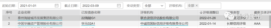根據(jù)wind資訊的統(tǒng)計數(shù)據(jù),2022年1月1日至3月9日,國內(nèi)信用債券市場上債券發(fā)行人評級正面變動的只有兩例。其中,華融資產(chǎn)為評級負(fù)面調(diào)整為正面,主體信用等級調(diào)升的只有泰州海陵城市發(fā)展集團有限公司,主體信用等級由AA調(diào)升至AA+。