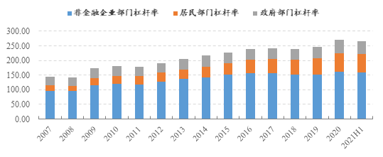細分部門來看:居民部門在持續上升;但是最大的還是占比還是非金融企業部門;但是由于融資平臺這一馬甲存在,企業部門的杠桿率是顯著高估;而政府債務則可能低估。