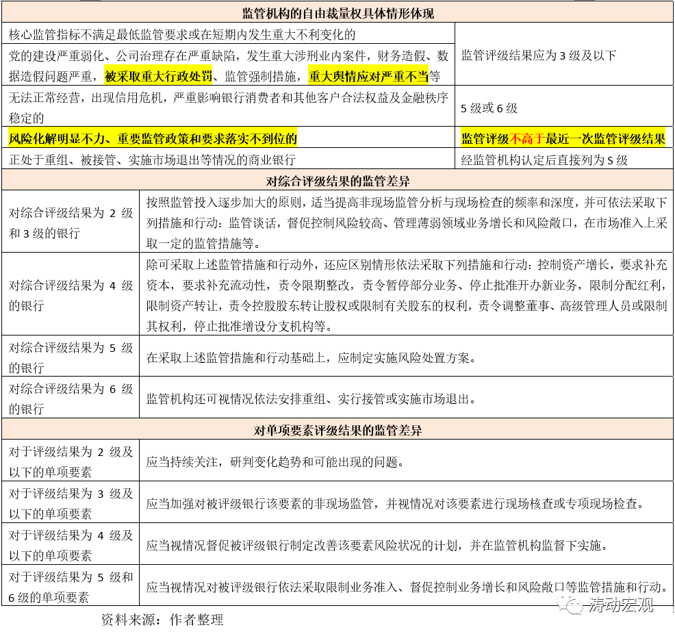 (5)監(jiān)管機(jī)構(gòu)可根據(jù)評(píng)級(jí)結(jié)果的差異,采取不同的監(jiān)管舉措,一般根據(jù)評(píng)級(jí)檔次的高低,按照監(jiān)管投入逐步加大的原則,適當(dāng)提高監(jiān)管力度。目前來看,只有評(píng)級(jí)結(jié)果為1級(jí)的銀行,才可以豁免相應(yīng)監(jiān)管。