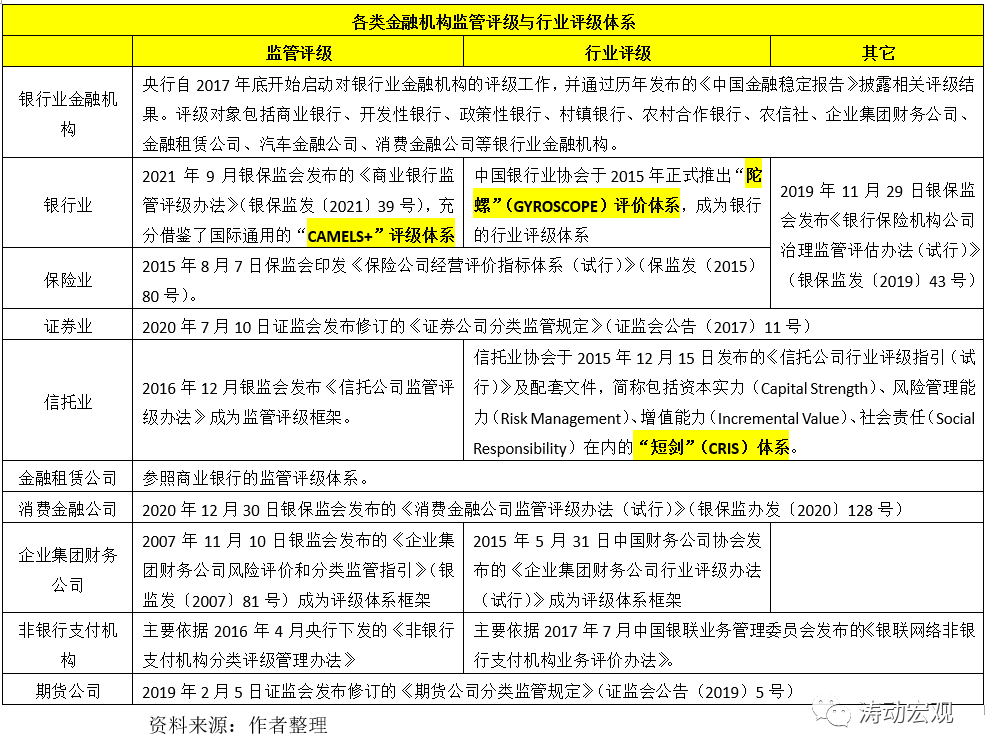 (三)一般情況下,監(jiān)管部門負(fù)責(zé)相應(yīng)的監(jiān)管評(píng)級(jí)審定工作,行業(yè)協(xié)會(huì)則主要負(fù)責(zé)行業(yè)評(píng)級(jí)(結(jié)果通常會(huì)對(duì)外公開)。當(dāng)然二者有時(shí)也會(huì)共用一套體系。
