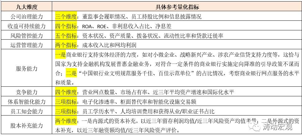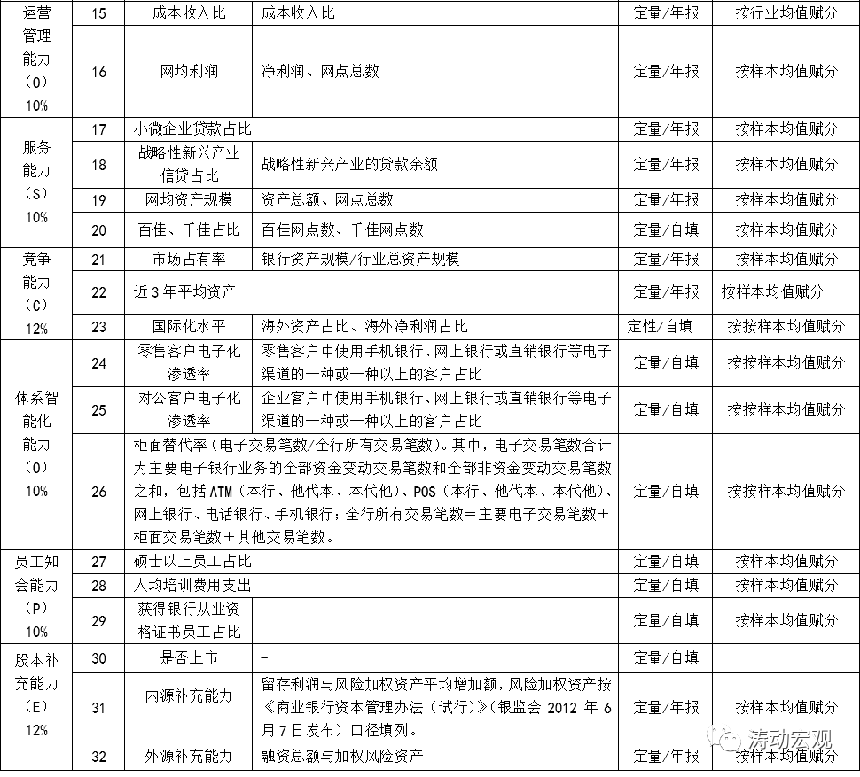 監(jiān)管評(píng)級(jí)之外,始于2015年的陀螺評(píng)價(jià)體系這里也略微提及一下。2013年中國(guó)銀行業(yè)協(xié)會(huì)成立課題組進(jìn)行研究,并于2015年正式推出“陀螺”(GYROSCOPE)評(píng)價(jià)體系,從公司治理能力(Governance)、收益可持續(xù)能力(Yield sustainability)、風(fēng)險(xiǎn)管控能力(Risk control)、運(yùn)營(yíng)管理能力(Operational management)、服務(wù)能力(Service quality)、競(jìng)爭(zhēng)能力(Competitiveness)、體系智能化能力(Organizational intellectualization)、員工知會(huì)能力(Personnel competence)、股本補(bǔ)充能力(Equity funding)等九個(gè)維度32項(xiàng)指標(biāo)入手,對(duì)全國(guó)性銀行與地方性銀行進(jìn)行綜合評(píng)價(jià)。不過這幾年,陀螺評(píng)價(jià)體系的影響力和受到的關(guān)注度有下降的趨勢(shì)。