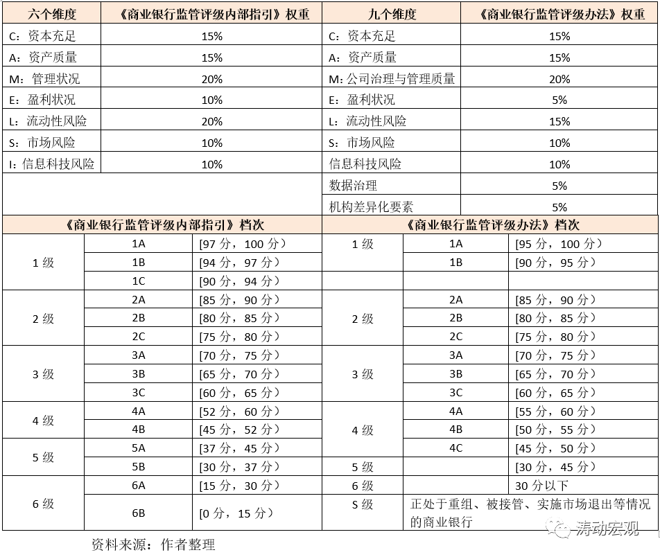 (2)商業(yè)銀行監(jiān)管評(píng)級(jí)充分借鑒了國(guó)際通用的“CAMELS+” 評(píng)級(jí)體系(即Capital adequacy、Asset quality、Management quality、Earnings、Liquidity、Sensitivity to market risk等六個(gè)英文單詞的首字母拼組),不過39號(hào)文在借鑒“CAMELS+”體系的基礎(chǔ)上,新增了數(shù)據(jù)治理維度和機(jī)構(gòu)差異化要素維度,并對(duì)相應(yīng)維度的權(quán)重進(jìn)行了調(diào)整。其中,39號(hào)文將盈利狀況和流動(dòng)性風(fēng)險(xiǎn)維度的權(quán)重分別下調(diào)5個(gè)百分點(diǎn)至5%和15%,保持資本充足、資產(chǎn)質(zhì)量、公司治理與管理質(zhì)量、市場(chǎng)風(fēng)險(xiǎn)、信息科技風(fēng)險(xiǎn)等五個(gè)維度的權(quán)重不變。