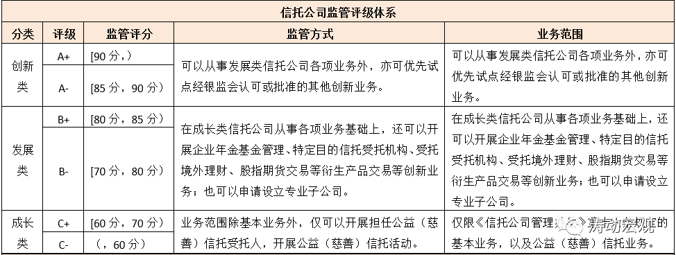 第三,信托公司的監(jiān)管評(píng)級(jí)主要分為創(chuàng)新類、發(fā)展類和成長(zhǎng)類三個(gè)大類,并進(jìn)一步按照A、B、C分為六檔,通常情況下只有評(píng)級(jí)結(jié)果在B-及以上的信托公司才能稱之為良好。
