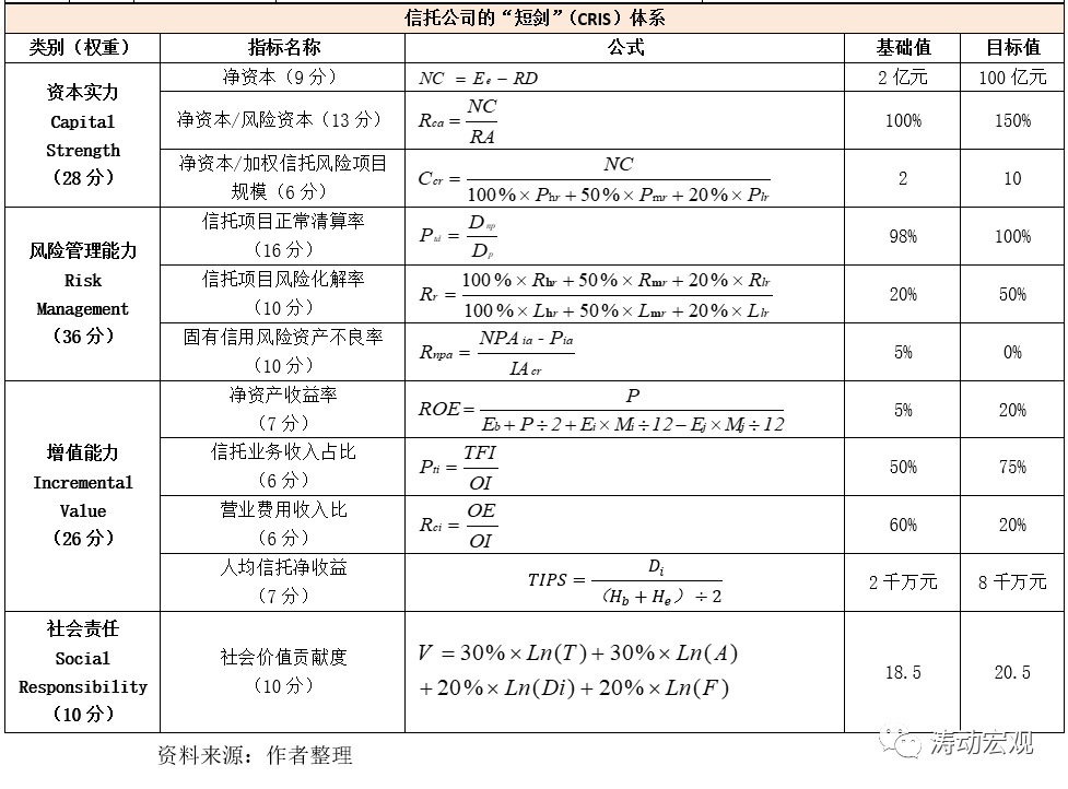 (1)中國(guó)信托業(yè)協(xié)會(huì)于2015年4月正式啟動(dòng)《信托公司行業(yè)評(píng)級(jí)指引(試行)》及配套文件起草工作, 2016年試行推動(dòng)形成所謂的“短劍”(CRIS)體系,該體系涵蓋四大板塊、11個(gè)指標(biāo),具體包括資本實(shí)力板塊(Capital Strength)、風(fēng)險(xiǎn)管理能力板塊(Risk Management)、增值能力板塊(Incremental Value)、社會(huì)責(zé)任板塊(Social Responsibility)。